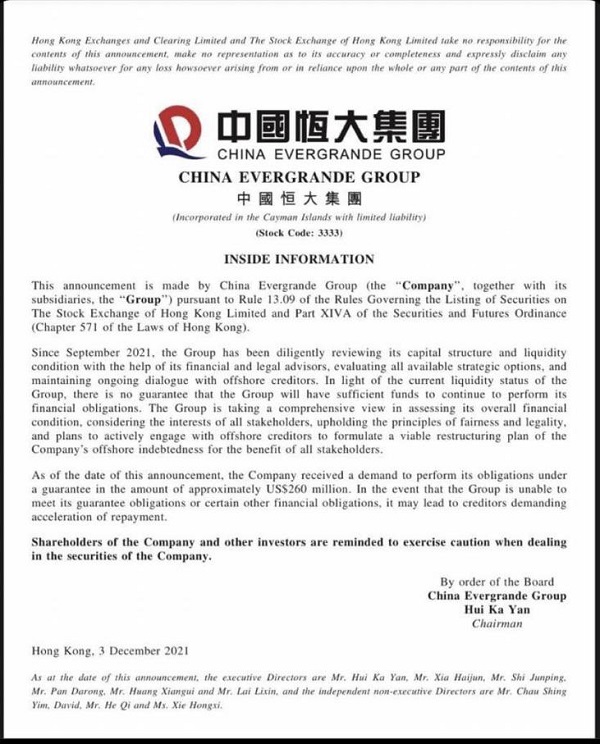 先週の金曜日、恒大集団は投資家に手紙を出し、同社が債券保有者への支払い義務を果たせないことを表明しました。これは、実質的には債務不履行の表明ですが、財務上の「債務不履行」の状態は、まだ恒大集団に対して完全には発動されていません(それはすぐに起こります)。これは、企業メディアが必死になって隠している手紙の画像です。