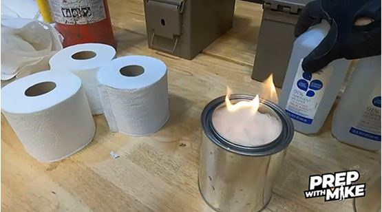 トイレットペーパー、消毒用アルコール、ペンキ缶、消火器などが映っている動画からのグラブ。このアルコールストーブは、狭い場所を暖めたり、お湯を沸かしたりするのに使うことができます。