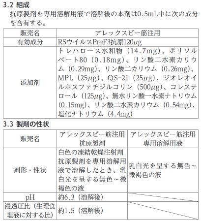 「アブリスボ(ファイザー)」「アレックスビー(グラクソ・スミスクライン)」「エムレスビア(モデルナ)」の3種類が日本で承認済みであり、いずれも主に60歳以上の高齢者を対象としている[9][10]。・・