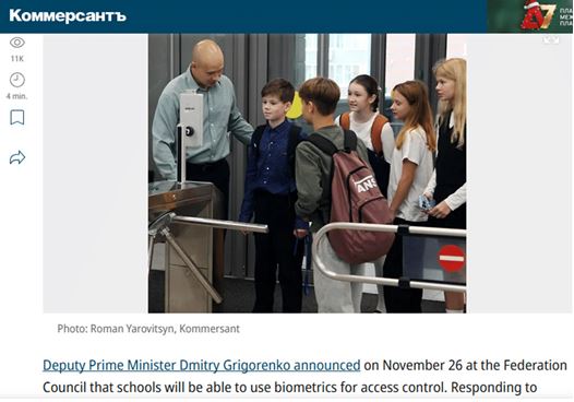 このブログで報告したように、 8月末、ロシア連邦副首相兼政府行政機関参謀総長のドミトリー・グリゴレンコ[Dmitry Grigorenko]は、小学生の身元確認に生体認証を使用する利点について、よく知られた言葉で説明しました。