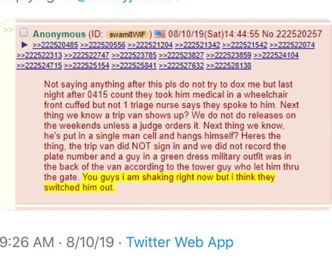 さて、今週、文書の中で爆発的に広まった衝撃的なニュースを見てみよう。2019年8月10日の朝、世界中にエプスタインが「死亡した」と伝えられた朝の、謎めいた4chanの投稿である。