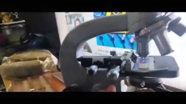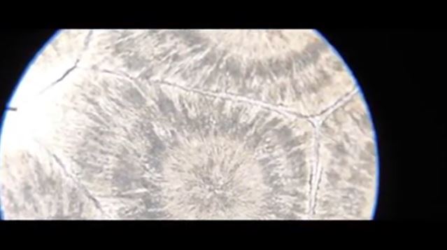 実験的なワクチンの接種液を見てるんです。実験的なワクチンです。15倍の接眼レンズと9倍の対物レンズで見ています。浮いているナノチューブの格子が見えますか?