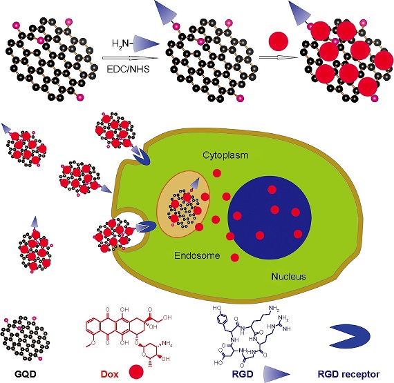 ここにあるのは、2015年に具体的に行われた研究論文で、がん細胞内に化学療法剤を酸に反応させて標的化するトレーサブルなドラッグデリバリーに応用できることを実証しています。この研究では、グラフェン量子ドットにドキソルビシンを担持させ、細胞内に放出しています。このことは、彼らの研究の図9の模式図にも完全に反映されています。
