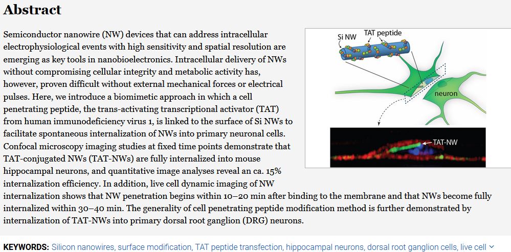 Keywords: Silicon nanowires; TAT peptide transfection; dorsal root ganglion cells; hippocampal neurons; live cell confocal imaging; membrane penetration; surface modification.