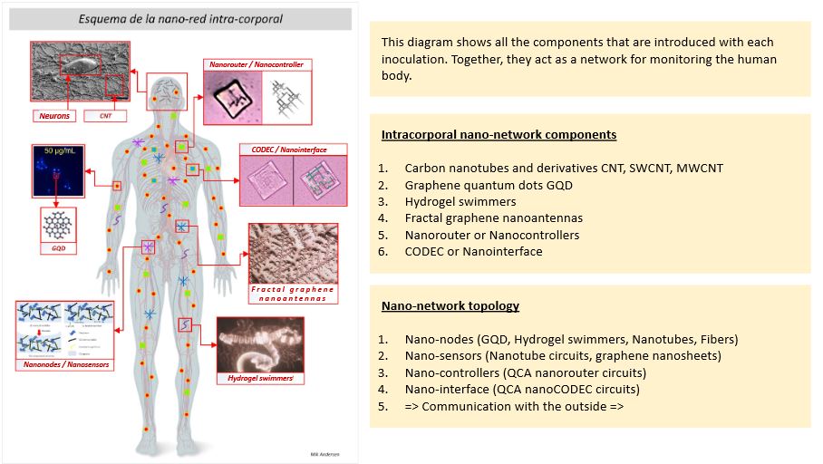 La Quinta Columnaは、人々が接種を受けるたびに形成される体内ナノネットワークの概要を発表しました。この要約を書いたのは、研究ブログCorona2Inspectのオーナーであるミク・アンダーセン[Mik Andersen]で、彼は著名な科学者であり、La Quinta Columnaとパブロ・カンプラ博士[Pablo Campra]の研究に偽名で協力することにしました。