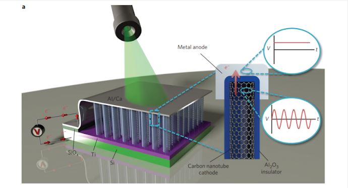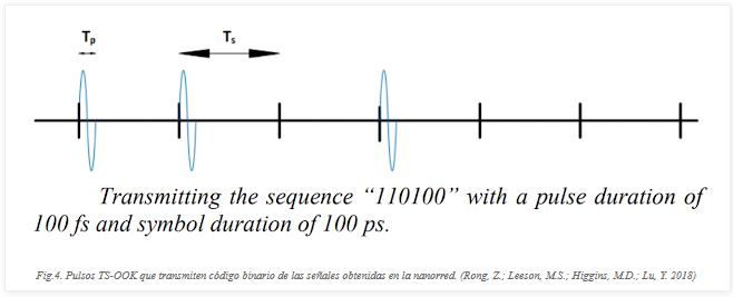 Rongの論文では、引き続きCNTレクテナに関する非常に重要な手がかりが示されており、「CNTレクテナが生成する出力電圧は数十ミリボルトのオーダーであり、通信用のチャネルアクセス方式はナノネットへのフェムト秒パルスに基づいている」と述べられている。「・・・(バイナリコードの)数字の1は100fsのパルス、つまり長いパルスで送信され、数字の0は無音で送信される・・・隣接ビット間の分離時間はパルス時間の1000倍(Ts = 100ps)なので、平均電力はnWレベルに戻ってくる。したがって、CNTレクテナの出力電力は、システム(ナノネットワーク)の電力要件を満たすことができる。」