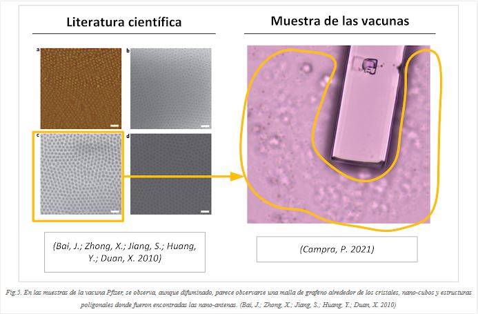 図5. ファイザーのワクチンサンプルでは、ナノアンテナが見つかった結晶、ナノキューブ、多角形構造の周囲に、拡散しているグラフェンのメッシュが観察されるようだ。(Bai, J.; Zhong, X.; Jiang, S.; Huang, Y.; Duan, X. 2010) |