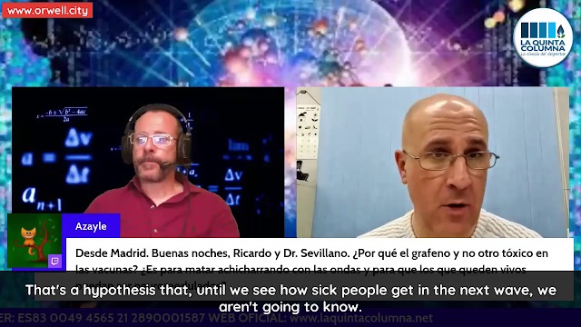 リカルド・デルガド:マドリードから。「こんばんは、リカルドと、セヴィラーノ先生。なぜワクチンにグラフェンが使われていて、他の毒物が使われていないのでしょうか?波動で人を焦がして殺し、生き残った人が神経変調を受けられるようにするためでしょうか。」