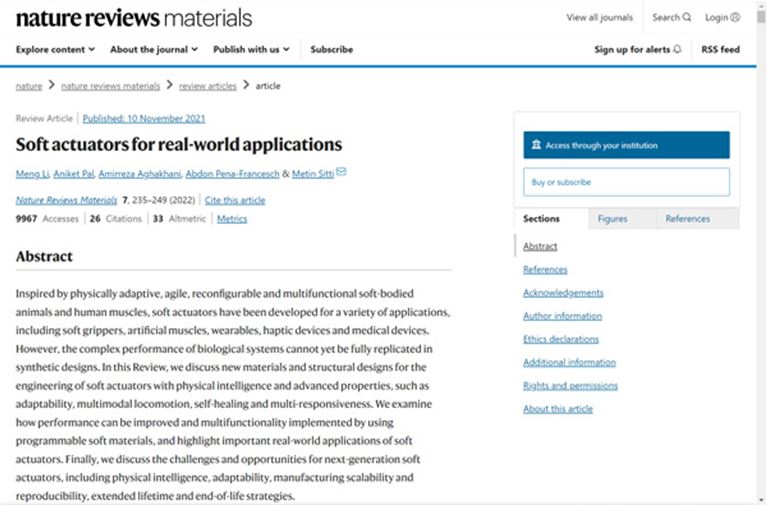 Nature Reviews Materials誌から、『Soft actuators for real-world applications(実世界で使えるソフトアクチュエータ)』と題した科学論文をご紹介します。