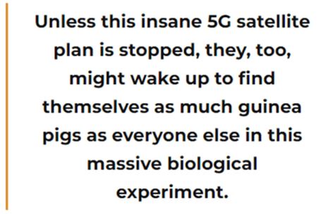 しかし、5Gの有力者たちは、5Gの文献によると地球を「覆い尽くす」ことを意図していると自慢されている人工衛星をどのように回避するのだろうかと疑問に思う人がいる。おそらく衛星ビームは、彼らが住んでいる地域を避けるだろう。あるいは、そうではないかもしれない。この非常識な5G衛星計画を止めない限り、彼らもまた、この大規模な生物学的実験において、我々と同じようにモルモットであることに気づくかもしれないのである。