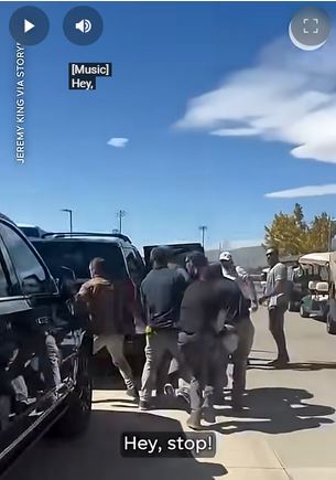 グループのこの最後の画像では、SUVのサイドドアがオープンになり、「セキュリティ」チームが6'5インチのチャーリー・カークを入れていることがわかる。ブラウンシャツの男はどこに行くのか?