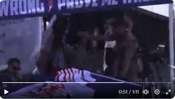 さて、よく見てみよう。チャーリーの首の入り口に、明瞭ではっきりと見えるフラッシュが走っている。これは「出口」の傷ではない。茶色のシャツの男の軌跡から、彼の首の傷の入り口までの軌跡をよく見よう。ライブ映像を拡大して見よう。ハイライトしたのは彼のTシャツではない。Tシャツの襟ぐり上部に白いフラッシュが走っている。30フレーム/秒のフォーマットで、1~2フレーム程度・・・ちょうど25~26秒のところ。 皮肉なことに、彼が「暴力」という言葉を発した直後だ・・・