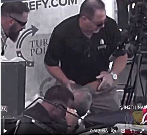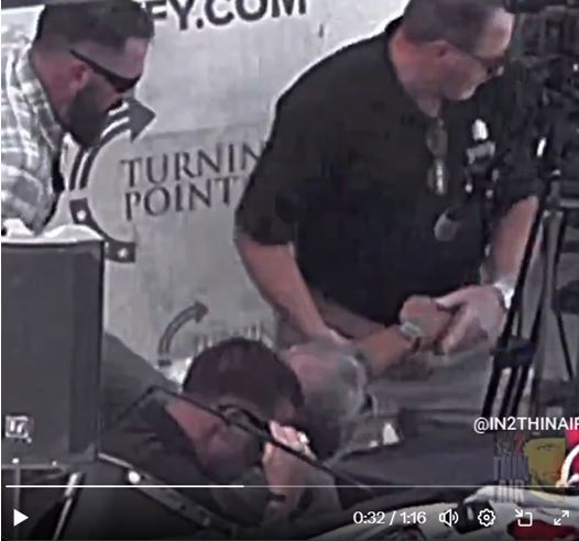 左の黒いシャツの男が、チャーリ-に何かをしようと必死で、ほとんど力みが入っているように見えるのに気付くだろうか?何かを探しているのだろうか?弾丸の破片だろうか?レイバンのMetaサングラスで録画されているであろう映像を見てみたいものだ。