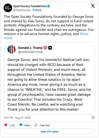 ソロスが資金提供しているグローバリスト系NGO、オープン・ソサエティ財団は、Xでの声明でトランプ大統領の脅迫を強く非難した。
