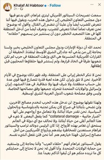 アル・ハブトゥール氏はソーシャルメディアへの投稿で、湾岸協力会議(GCC)諸国は紛争において米国を支持し、米国の保護を受けるべきだと示唆したリンジー・グラハム[Lindsey Graham]上院議員の発言を批判した。