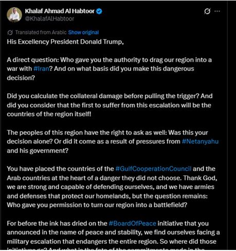 UAEの実業家、ハラフ・アフマド・アル・ハブトゥール氏は、米国が中東を戦争に引きずり込んでいると非難し、イランとの戦争で米国とイスラエルを支援するよう湾岸諸国に求める声を拒否した。