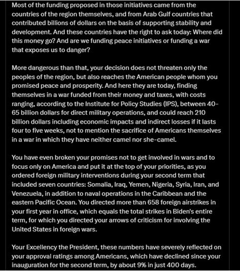 「我々は他国の利益のためにこの戦争に参加することはないし、他国の利益を追求する戦争で我が子を犠牲にすることもない」と述べ、湾岸諸国の人々の命は「この世の何よりも尊い」と付け加えた。