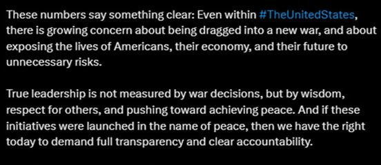 「ドナルド・トランプ大統領、率直に質問します。誰があなたに、この地域をイランとの戦争に引きずり込む権限を与えたのですか?」と、彼は記した。