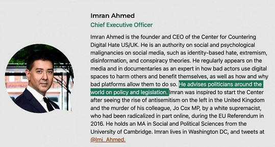 サッカーは、CCDHとアーメドは民主党および英国労働党と密接な関係にあり、ソーシャルメディアプラットフォームに米国および世界中のユーザーを検閲することを義務付ける英国のオンライン安全法を含む、海外の検閲法を支持していると述べた。