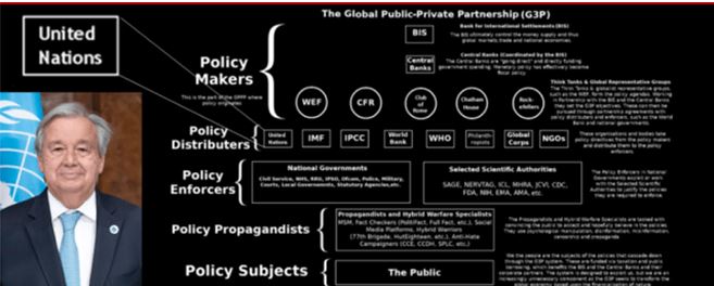 デジタル ID の使用は世界的にますます一般的になりつつあり、トニー・ブレアが協力している 45 の政府のうち約 4 分の 3 が何らかの形のデジタル ID を採用しており、そして、世界銀行のアジェイ・バンガ[Ajay Banga]総裁はそれを最優先事項と見なしている。(世界銀行は国連のワンワールド政府システムを構成する組織の 1 つである。国連がグローバル官民パートナーシップ (「GPPP」) にどのように適合しているかについては、下の画像を参照してください。)