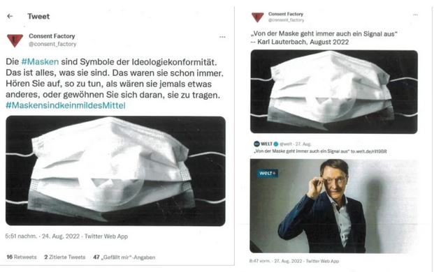 右側は、ドイツの全国紙Die Weltがツイートしたカール・ラウターバッハ[Karl Lauterbach]保健相の言葉。「マスクは常にシグナルを発している。」 そう、カール、私が言いたかったのはまさにこのことだ。