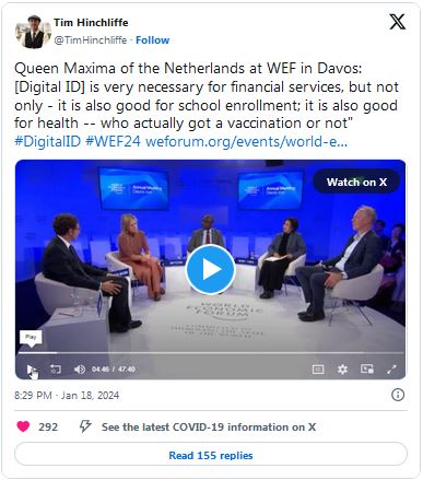 Queen Maxima Says Digital ID Is Good For Knowing ‘Who Actually Got A Vaccination Or Not’: WEF in Davos(マキシマ王妃、デジタルIDは「誰が実際にワクチン接種を受けたかどうか」を知るのに役立つと発言:ダボスのWEF)
