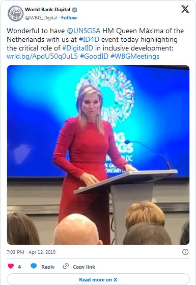 今日の#ID4Dイベントに @UNSGSAオランダのマキシマ王妃が参加し、包括的な開発における #DigitalIDの重要な役割を強調できたことは素晴らしいことです: https://t.co/bNRaIulRc7 #GoodID #WBGMeetings pic.twitter.com/nNCO8qP50q