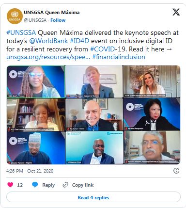 #UNSGSAのマキシマ王妃は、本日の@WorldBank #ID4Dイベントで、#COVID-19 からの弾力的な回復のための包括的なデジタル ID について基調講演を行いました。ここで読んでください→https://t.co/vD9uYPtA7P #financialinclusion pic.twitter.com/8W2tk2ImIY