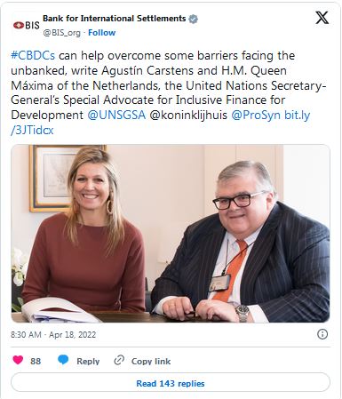 マキシマ王妃は、デジタル ID なしでは運用できない中央銀行デジタル通貨 (「CBDC」) の熱心な支持者でもある。