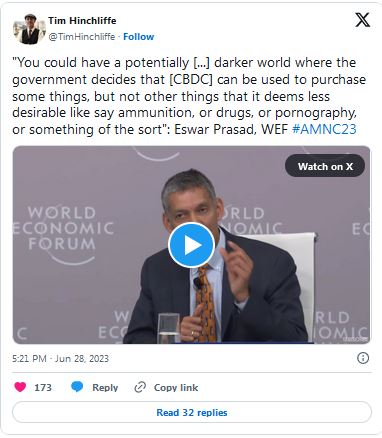 「潜在的には、あるものを購入するために中央銀行のお金の単位を使用できるが、弾薬、麻薬、ポルノ、またはその類のものなど、あまり望ましくないものとみなしたものは使用できないと政府が決定する、暗い世界になる可能性があります。」—エスワル・プラサド、WEFニューチャンピオン年次総会、2023年6月
