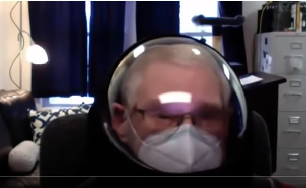 「来週お会いするときは、このヘルメットをかぶっています・・・周りにはHEPAフィルターがついているので、私が吸う空気は全てHEPAフィルターを通って入ってきます。」