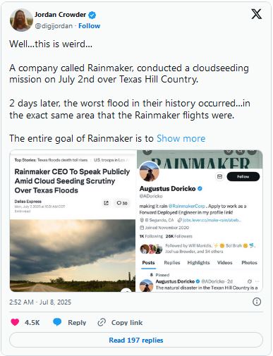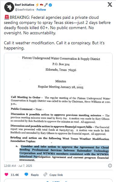 速報:連邦政府機関は、致命的な洪水が60名以上を死亡させた2日前に、テキサスの空を散布するために民間のクラウドシード会社に支払いました。パブリックコメントはありません。監視なし。説明責任はありません。