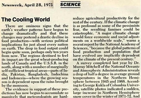 1975年、ニューズウィーク誌は「寒冷化する世界」という記事で、新たな氷河期が迫っていると宣言したことで有名です。これは単なるメディアの作り話ではなく、気候学者の中にも同様の警告を発する者がいました。