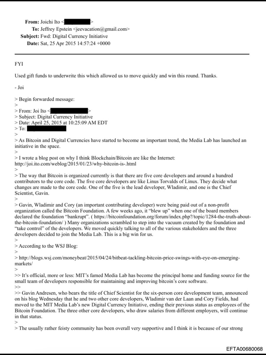 そしてビットコインファウンデーションが破産し、メールにあるようにビットコインの開発は伊藤穰一氏とジェフリーエプスタイン氏のコントロール下に入った。このあたりの経緯は今回の文書で初めて知った。彼らが背後でコントロールしていたことはコアエンジニアしか知らずにここまで来たということだ。