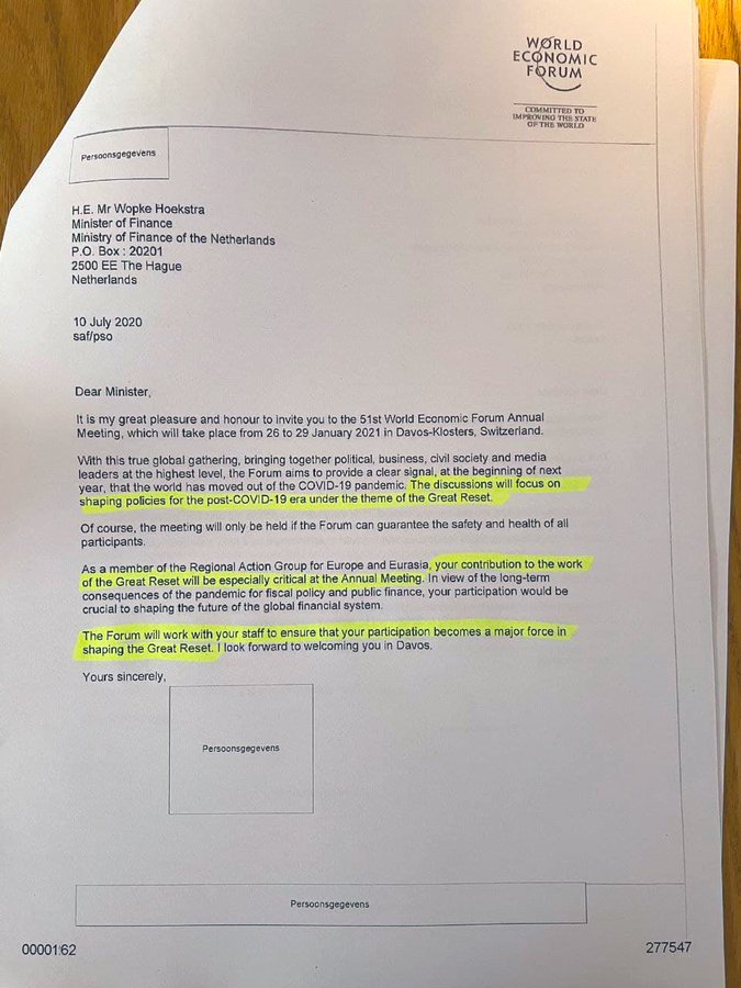 オランダ下院議員ペパイン・ファン・ホゥヴェリンゲン[Pepijn van Houwelingen]の情報公開請求の結果、WEFからオランダの大臣シグリッド・カーグ[Sigrid Kaag]に宛てた書簡には次のように書かれています。「フォーラムは、あなたの参加がグレートリセットを形成する大きな力となるよう、あなたのスタッフと協力していきます。」