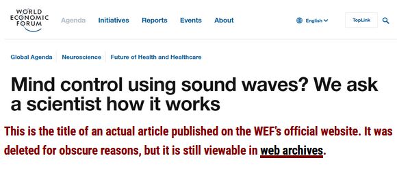 2018年、WEFでの話題のひとつは「音波を使ったマインドコントロール」であった(それに関する私の記事の全文はこちら)。このタイトルはセンセーショナルにするために改変したわけではなく、まさにWEFで使われた言葉である。