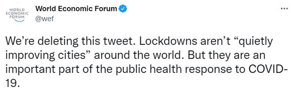 ご覧のように、ビデオを削除したにもかかわらず、WEFはロックダウンを賞賛し続けた。それは、WEFが「コヴィディアン」の生活が恒久的になることを望んでいるからだ。