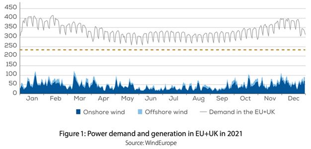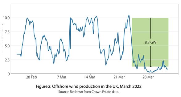 上のグラフに示すように、変動の強化の効果は劇的である。茶色の破線で示した2021年のEUと英国の公称発電設備容量は236GWだが、1日の最高出力は3月26日の103GWに過ぎない。昨年3月の英国の洋上での風力発電量をプロットした2番目のグラフでは、その信頼性の低さがさらに効果的に示されている。