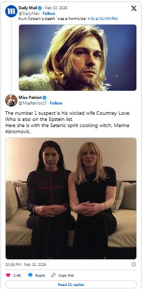 Epstein Files Reveal Courtney Love ‘Murdered’ Kurt Cobain To Protect Elite Pedophile Ring February 13, 2026 Baxter Dmitry News, US 14 Comments