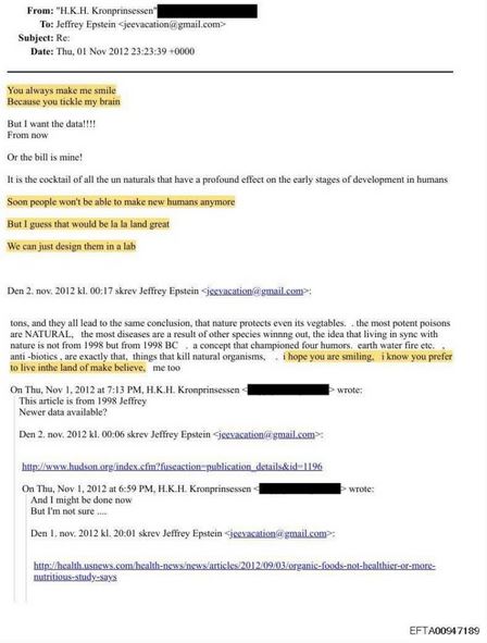 2012年11月に彼女がエプスタインに送った電子メールは、エプスタインとその関係者がクローン作製や実験室で育った子供たちに資金を提供していた秘密研究の知識をほのめかしており、「もうすぐ人間は新しい人間を作ることができなくなるでしょう…でも、それは素晴らしいことだと思うよ、ラ・ラ・ランド・グレート。実験室でデザインするだけでいいんだ。」