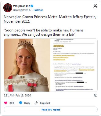 Norway’s Crown Princess Emails to Epstein Expose Elite Agenda to Grow Cloned Children in Labs February 14, 2026 Baxter Dmitry News, US 7 Comments