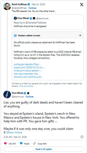Elon Musk Demands FBI Probe Reid Hoffman’s ‘Ice Cream’ Code Words With ‘Close Friend’ Jeffrey Epstein February 15, 2026 Baxter Dmitry News, US 9 Comments