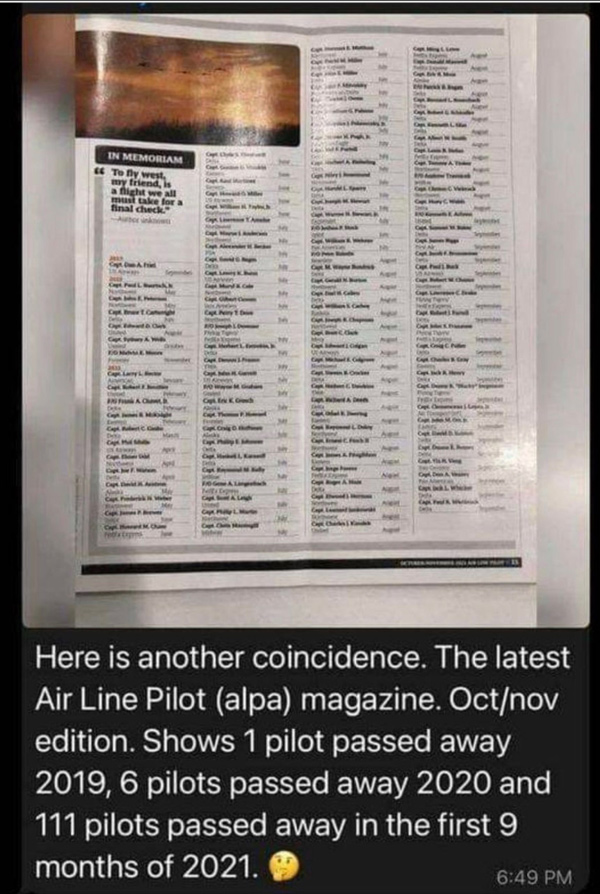 スティーブ・カーシュ[Steve Kirsch]は、この憂慮すべき現象についてSubstack.comにも書いています。2021年に死亡したパイロットのリストを掲載したAir Line Pilot Association誌の写真はこちらです。