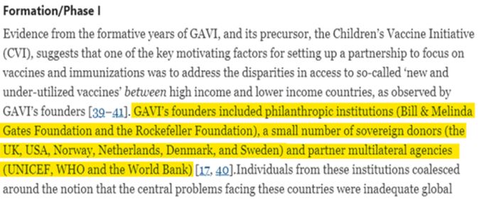2003年、ゲイツ財団は、ワクチン接種のアジェンダを推進するための官民連携の必要性を示す報告書を作成した。その報告書のタイトルは『Global Health Partnerships: Assessing Country Consequences(グローバル・ヘルス・パートナーシップ:各国の結果の評価)』であった。 この報告書には、「成功を測るために使われた重要な要因の中には、住民の全体的なワクチン接種率も含まれていた」と書かれている。 言い換えれば、公共政策のワクチン接種を通じて世界的に利益を得ようとする民間組織の動きが、文書化され始めたのである。