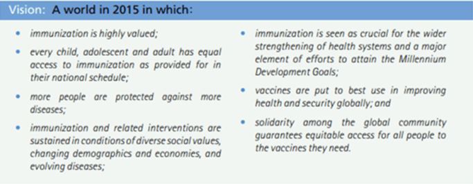 2012年5月、ゲイツ財団のビジョンである「ワクチンの10年」を達成するため、グローバル・ワクチン・アクション・プラン2011-2020が承認された。 この計画は、ゲイツ財団、GAVI、WHO、ユニセフ、アフリカ指導者マラリア同盟、米国国立アレルギー感染症研究所(NIAID)が主導した。
