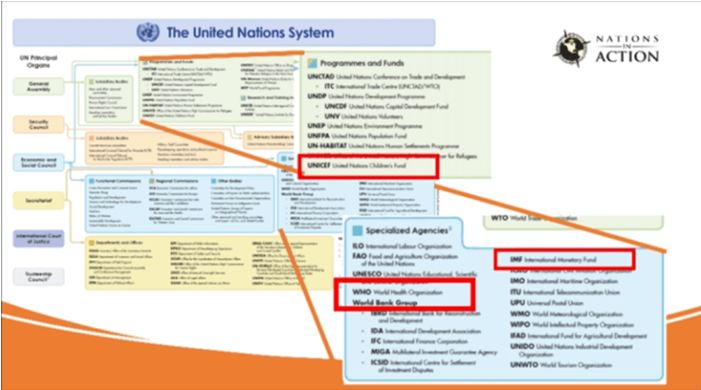 世間では、上記のような組織は独立しており、それぞれ独立していると思われがちだ。 WHO、世界銀行、IMFは国連の専門機関であり、ユニセフは国連のプログラムであり基金である。Nations in Actionのプレゼンテーションで言及された多くの組織は、国連全体のインフラストラクチャーの一部である(下の画像を参照)。
