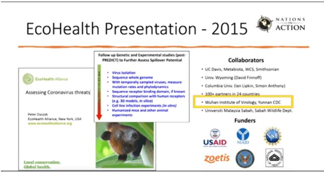 ダスザックが2015年に米国科学・工学・医学アカデミーで行ったプレゼンテーションのコピーには、エコヘルスアライアンスが武漢ウイルス学研究所と共同で行った研究が示されており、米国のさまざまな機関から資金提供を受けていた。 この研究では、ヒト化マウスの感染と、SARS-CoV-2スパイクタンパクが結合する細胞表面のタンパク質であるヒトACE2レセプターを用いたコロナウイルスの機能獲得研究が行われた。