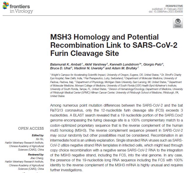 実際、SARS-CoV-2生物兵器の正確な遺伝子配列を特許化するための器として、モデルナが使われたのです。スイス、インド、イタリア、米国の科学者たちは、SARS-CoV-2に感染力を高める特性を与えた特定の19コードヌクレオチド配列をモデルナが特許化したことを示す論文を発表しました。著者らは、この19コードのヌクレオチド配列が自然に出現し、ユニークなフリン切断部位を含む可能性は3兆分の1しかない、と書いています。