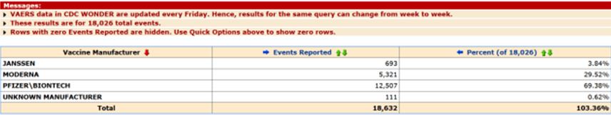 しかし、CDCは、実際にVAERSに報告される有害事象はわずか1~10%であると考えていることを認めているため、100万回接種あたりの割合は、両ワクチンとも大幅に高くなる可能性があることに留意する必要がある。