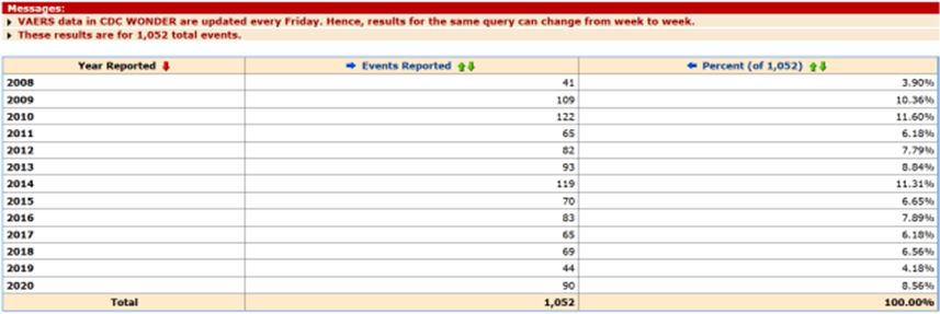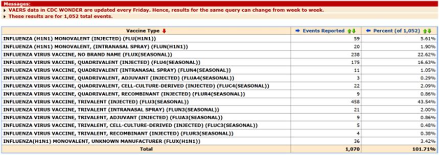 一方、同じVAERSデータベースによると、CDCは、2008年から2020年の間に利用可能なすべてのインフルエンザ用注射の副作用として発生したヘルペス/帯状疱疹感染症に関する1,052件の報告しか受け取っていない。
